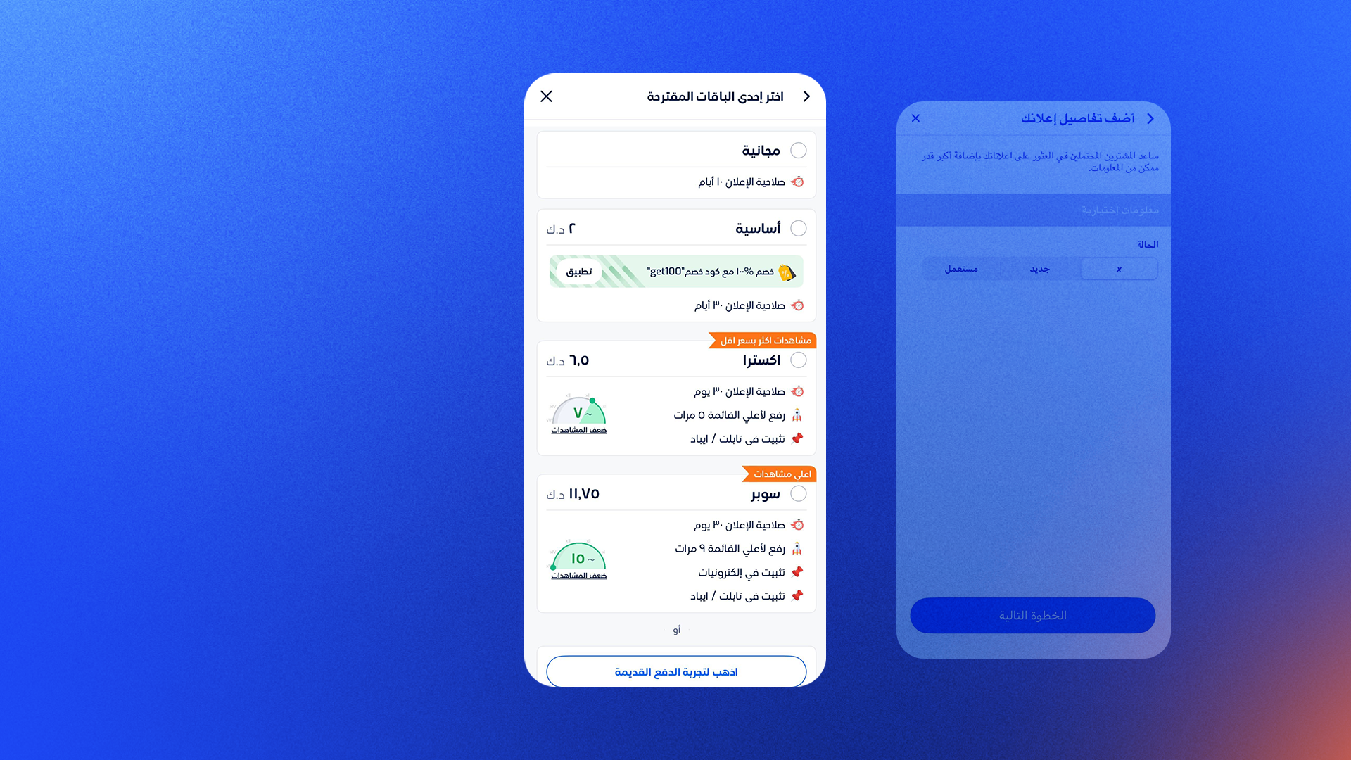 - باقة إكسترا: يتم دفع إعلانك للأعلى 5 مرات مع تثبيته في القسم الخاص به، مما يوفر حوالي 15x ضعف الظهور.
