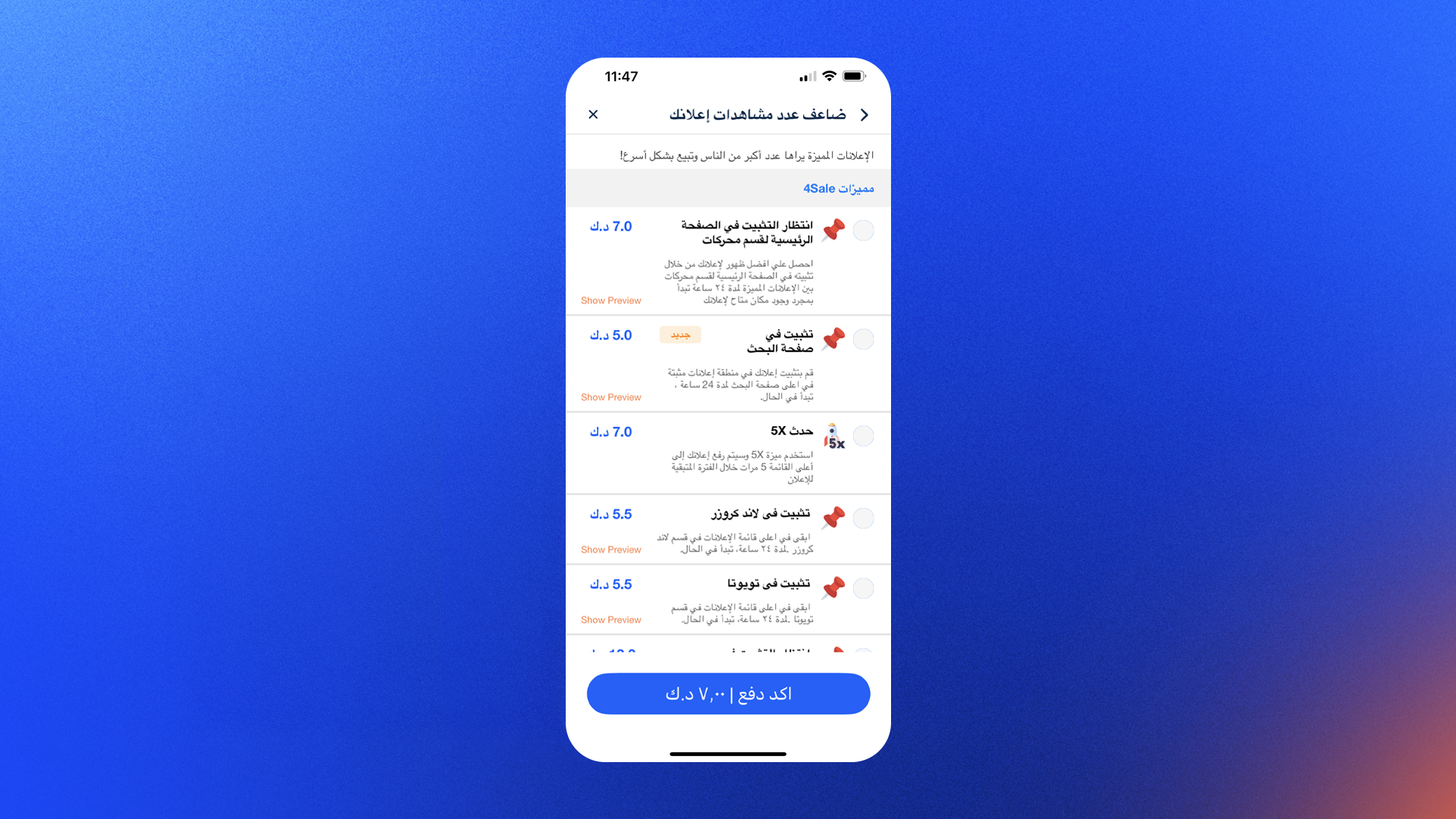 الباقات تمنحك ظهورًا ثابتًا، لكن المميزات الإضافية في 4Sale تسمح لك بدفع إعلانك للواجهة في الأوقات المهمة: